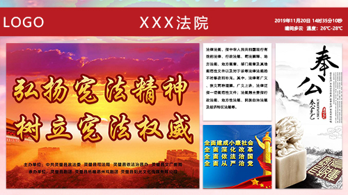 遇到緊急情況可以即時(shí)發(fā)布緊急信息、突發(fā)事件,插播法院媒體文件,實(shí)時(shí)的時(shí)間、天氣、政策法規(guī)、人員名單等內(nèi)容信息同步展示。