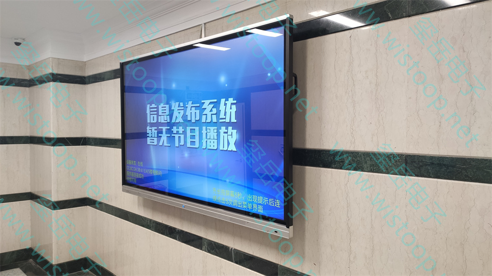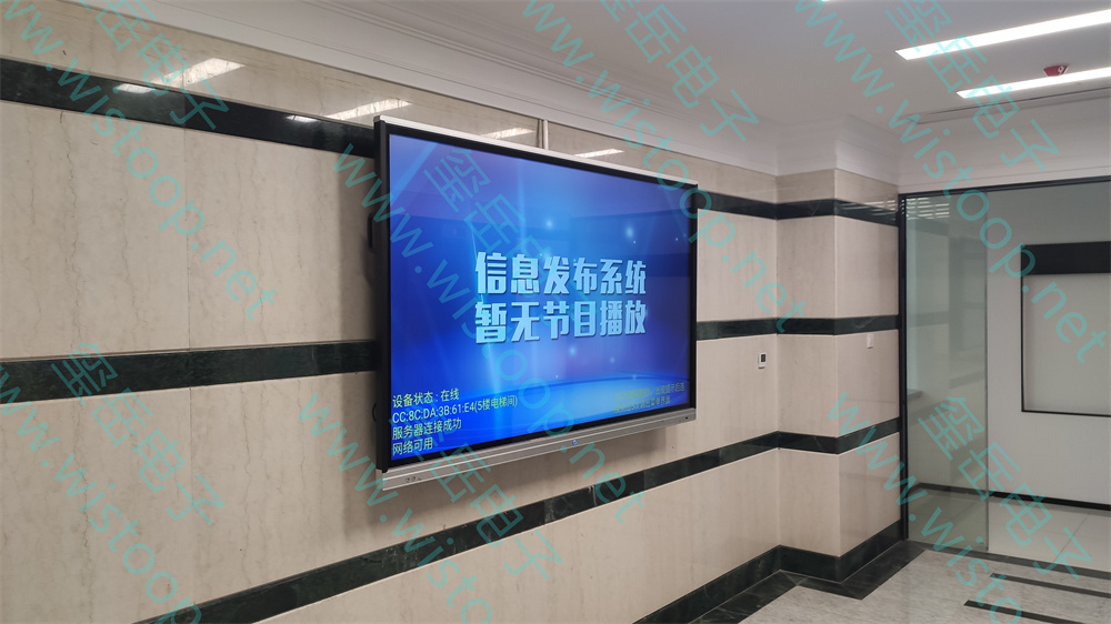 上海寶山工商銀行在其大廈中的11層電梯口安裝了WISTOOP E-BOX高清信息發(fā)布終端,并全部納入到WISTOOP網絡信息發(fā)布管理系統(tǒng)中進行統(tǒng)一管理。這套信息發(fā)布系統(tǒng)部署在工商銀行內部的管理服務器中,可以通過網絡來遠程控制和管理11臺E-BOX信息發(fā)布終端以及其播放的時間和內容。通過信息發(fā)布終端可以播放多種音視頻格式、滾動文字、圖片、網頁、動畫等的信息,并可以自由劃分顯示區(qū)域,把多種信息自由進行組合和展示。通過這套信息發(fā)布系統(tǒng)可以遠程設定信息發(fā)布終端的自動開關機時間,可以提前為每臺終端設定播放日程和播放列表。WISTOOP E-BOX高清信息發(fā)布終端可以連接匹配多種顯示設備,如液晶顯示屏、LED一體機、拼接屏、電視機等等。此項目選用了98寸高清液晶顯示一體機,展示效果大氣美觀。